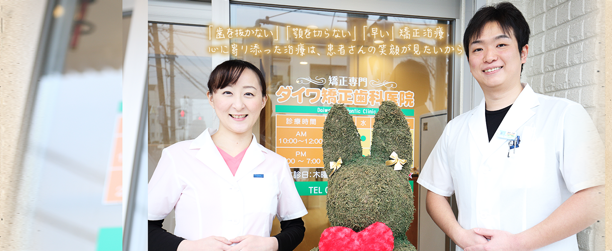 大阪府高槻市大和1丁目の歯医者、ダイワ矯正歯科医院のホームページをご覧いただき、誠にありがとうございます。当院は、医院の環境づくり、治療方法、費用など矯正治療に関わるすべてにおいて「患者として治療を受けるとしたら」を考えた患者様の目線を大切にした歯科医院です。