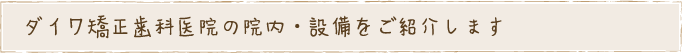 阿武山小学校より徒歩2分の高槻市の「ダイワ矯正歯科医院」では、なるべく抜歯や顎の手術をせずに歯並びの乱れを整える矯正治療を行っています。通常よりも短期間での治療も特長です。お子様の矯正治療はもちろん、大人の矯正も行っています。こちらのページでは当院の院内の設備をご紹介します。